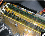 По всему модулю реализованы распайки различных клем, миниатюрных транзисторов и пр. Кроме того, на каждой со сторон модуля реализовано по восемь чипов Micron 8XG27-D9JVW. Вариант чипов хотя и не самый лучший, но, тем не менее, один из самых качественных и хорошо зарекомендовавших себя.