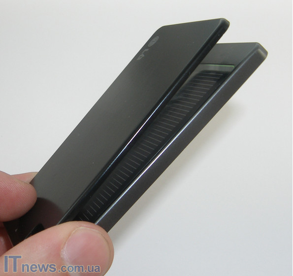 Примерно в сантиметре снизу и сверху корпус заметно "утолщается". Здесь на основной корпус нанесена еще одна пластина, которая, собственно и содержит элементы, превращающие солнечные лучи в энергию. Какова технология изготовления зарядки, 100% нам не известно – LG держит ее в строгой тайне, а разобрать устройство в поисках ответа мы не решились.