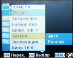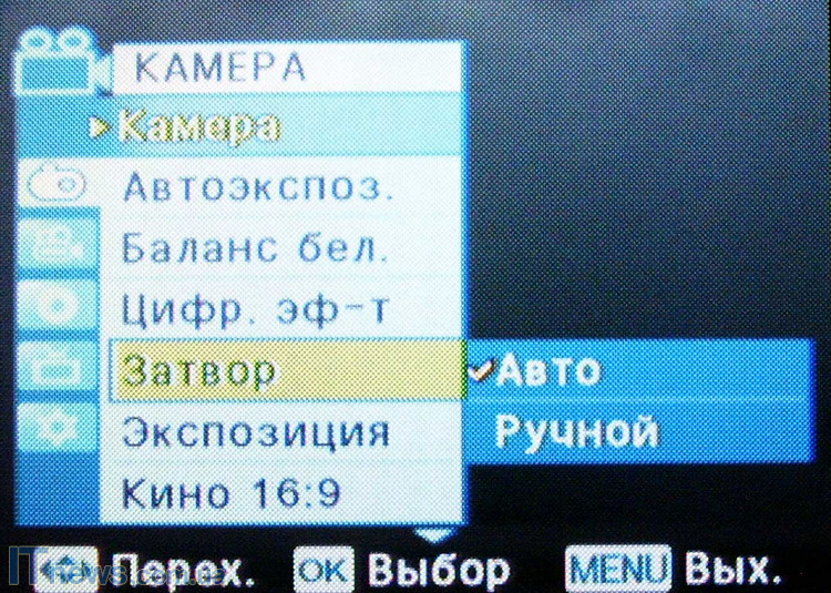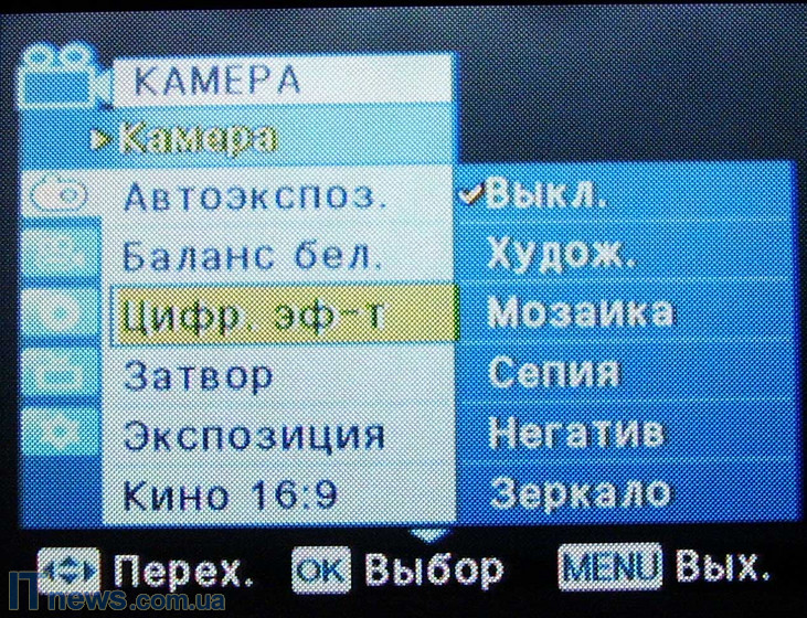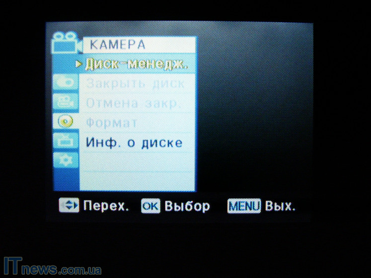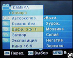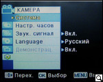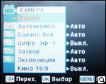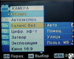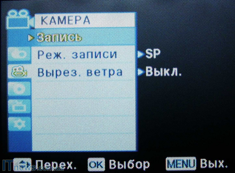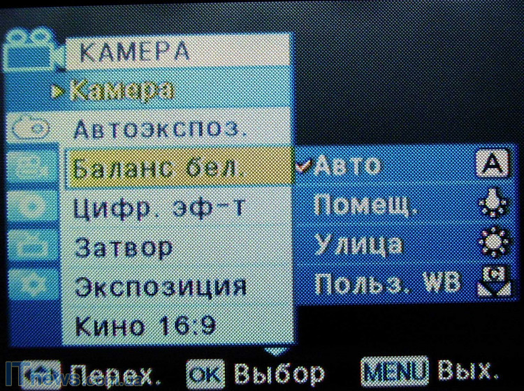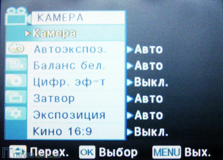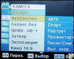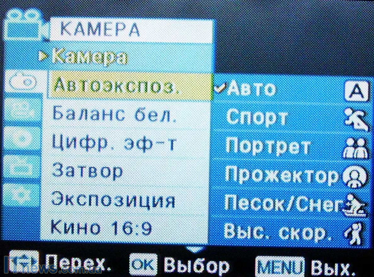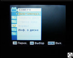 После загрузки и проверки системы и диска пользователь получает возможность выбора настроек камеры. Для этого жмем кнопку menu. Войдя на панель задач, видим расположение иконок подменю: "камера" "автоэкспозиция", "цифровые эффекты", "затвор", "экспозиция", "форматы съемки". Для пользователей, хоть в некоторой мере знакомых с тем, как устроена видеокамера, рекомендуем пройтись поэтапно и в зависимости от периода суток и объекта съемки произвести все необходимые манипуляции. Так, производитель предлагает шесть режимов автоэкспозиции ("авто", "спорт", "портрет", "прожектор", "песок"/"снег", "высокая скорость"), и четыре режима баланса белого ("авто", "помещение", "улица", "пользовательский web"). Кроме этого, как мы уже упоминали, есть возможность выбора экспозиции (ручная или авто), и формата съемки.