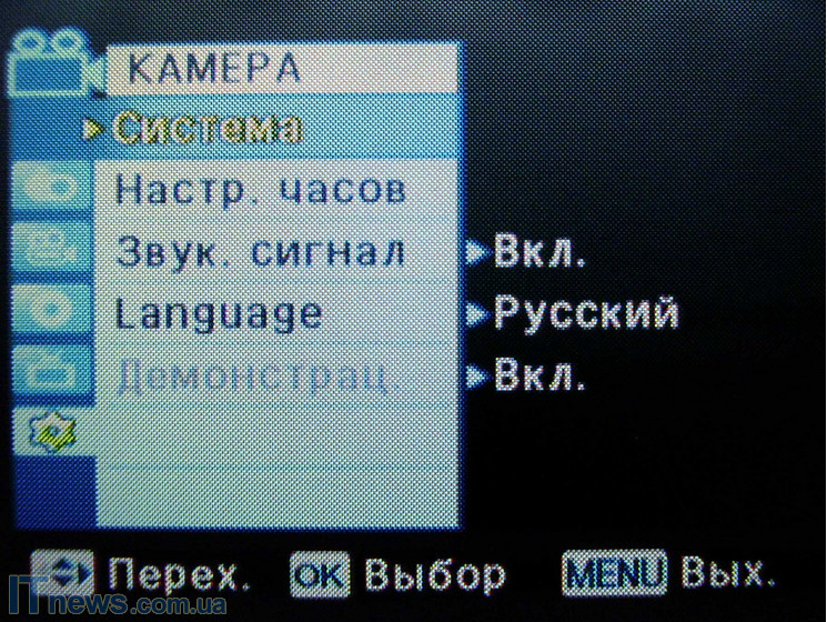 И последним подпунктом меню является раздел "Система", где пользователь может выбрать язык меню, отключить или включить звуковое сопровождение, а также настроить часы.