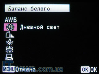 Баланс белого (авто, дневной свет, тень, лампа накаливания, люминесцентный свет, ручная установка и др.);