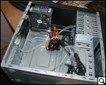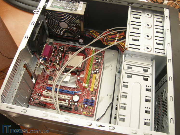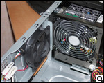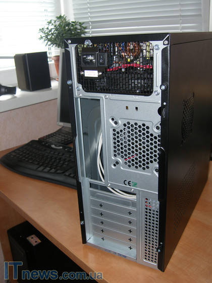 Внутри все достаточно грамотно – четкое расположение боксов крепления приводов, кардридеров и жестких дисков (либо диска), шикарный, весь в глянце блок питания, а также симпатичный 80 мм кулер на внутренней части тыльной панели. К слову, по словам производителя, на место 80 мм кулера, пользователь, при желании или необходимости, может прикрепить 90 и даже 100 мм. Впрочем, на наш взгляд, мощностей 80 мм кулера здесь вполне достаточно.