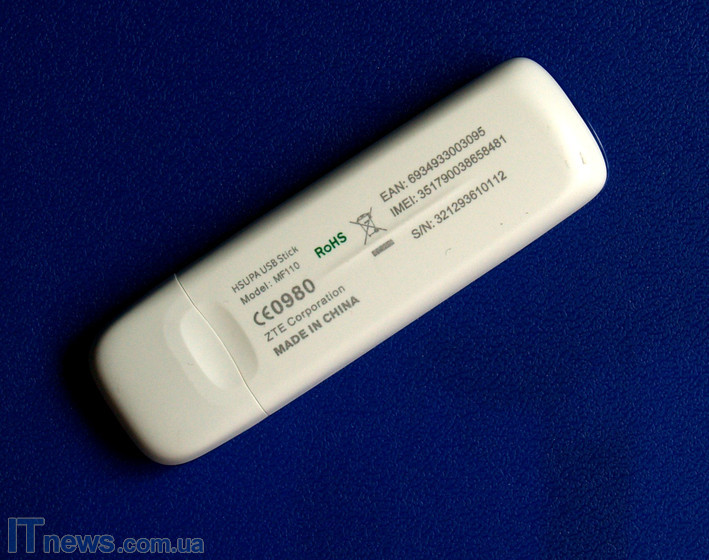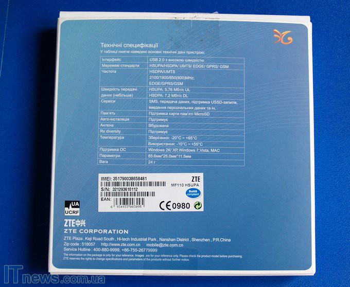 Итак, имеем очень компактный пакет с модемом ZTE MF110, который выглядывает сквозь прозрачное пластиковое окошко. На обратной же стороне коробки перечислены характеристики модема.