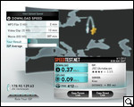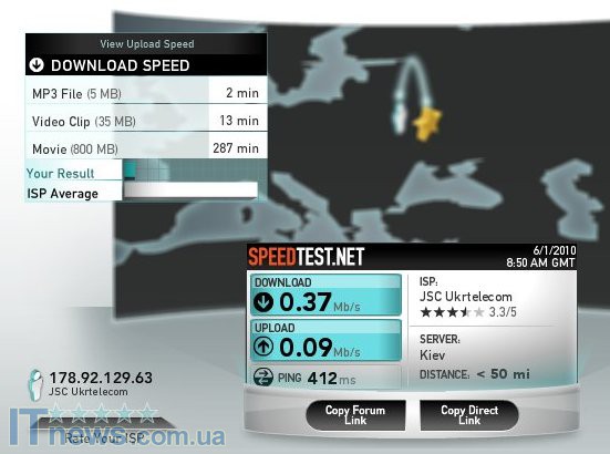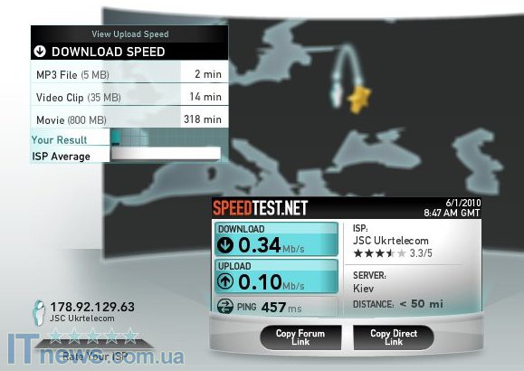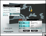 И напоследок проверяем скорость соединения. Мы находились внутри квартиры в метре от окна. Сигнал был среднего уровня. Показало 0,34 Мбит/с (download) и 0,10 Мбит/с (upload). После того, как модем был поднят на 20 см над столом и индикатор в программе показал улучшение сигнала, скорость тем не менее практически не изменилась.