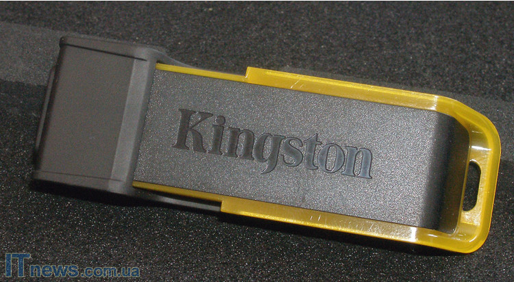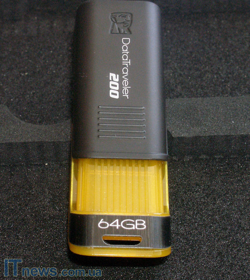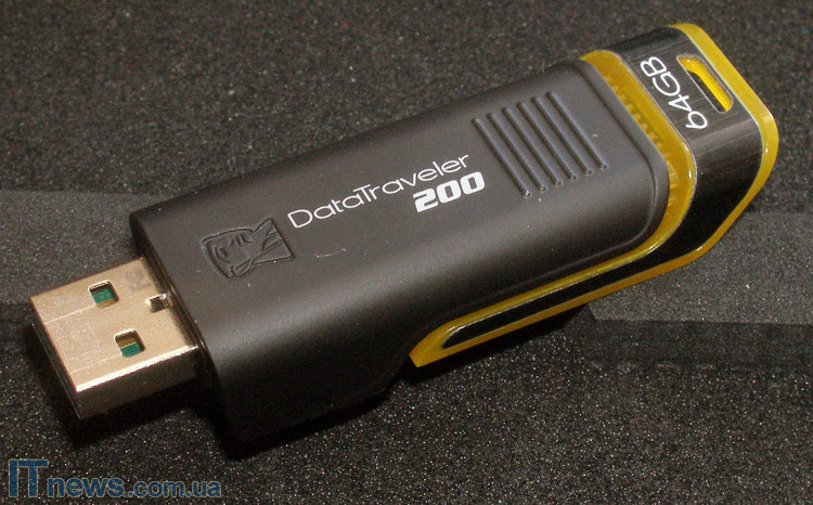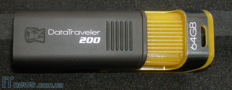 Корпус Kingston Data Traveler 200 (64ГБ) изготовлен из пластика. Пластик двух цветов – черный и желтый. Справедливости ради стоит отметить, что желтый пластик является своего рода отличительным знаком накопителя конкретного объема от собратьев по линейке, поскольку сам форм-фактор исполнения, а также основной материал корпуса идентичны другим представителям линейки.