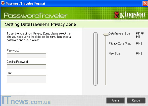 Интересен факт – файловая система флешки FAT 32 – так определяет ее операционная система компьютера. Более того, стандартным средствами Windows форматировать накопитель не получится – процедура имеет в некотором роде защиту, реализованную с целью предотвратить уничтожение программы Password Traveler. Форматирование возможно только при помощи этой программы. Однако вместе с тем, стоит учесть и тот немаловажный факт, что пользователю все равно не удастся создать посредством этой процедуры другую файловую систему. Что на выходе предугадать несложно - файлы более 4 ГБ в память Data Traveler 200 (64 ГБ) записываться не будут (ограничения для FAT32). Впрочем, не стоит забывать, что производитель предлагает ставить пароль на доступ к записям в памяти, тем самым подразумевая, что предназначение флешки, прежде всего, работать с массивами текстовых, а также графических данных, объем одного файла которых вряд ли превысит 4 ГБ.