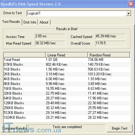 Тестирование проводилось при помощи программы DskSpeed. Результаты ниже.