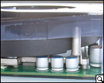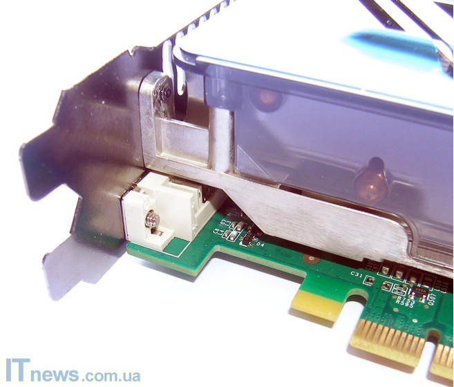 Непосредственно на самой плате, ближе к переднему торцу расположено некоторое количество транзисторов, а ближе к верхнему виднеется разъем для кабеля питания и другие функциональные элементы. Поскольку плата достаточно большая, а, кроме того, имеется мощная система вентиляции воздуха, без дополнительного питания просто не обойтись.