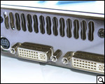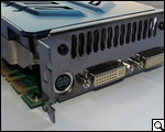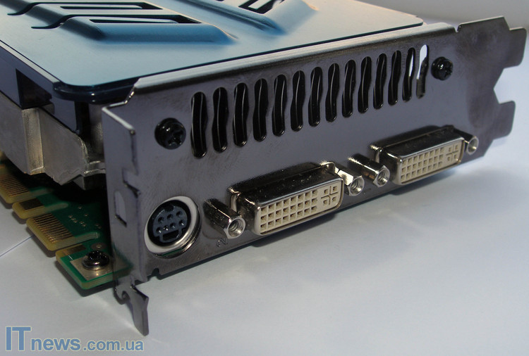 Традиционно к тыльному торцу привинчена металлическая рама, отвечающая одновременно и за фиксацию видеокарты на корпусе и за расположение несколько разъемов, интерфейсов и выводов. На ней же находится небольшая сетка, предназначенная для "прогонки" воздуха внутри системы.