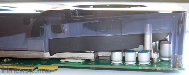 Легко заметить, даже не разбирая карточку, что под кулером расположена достаточно толстая алюминиевая вставка. Вставка проходит параллельно всей распайке платы.
