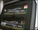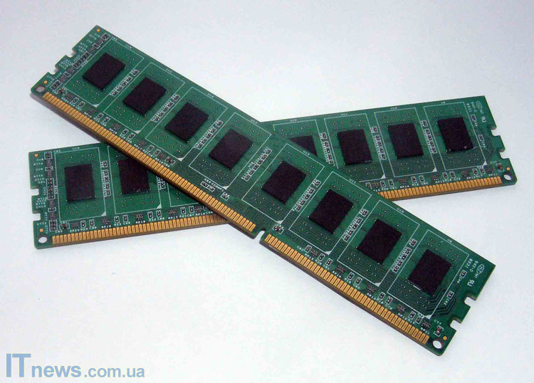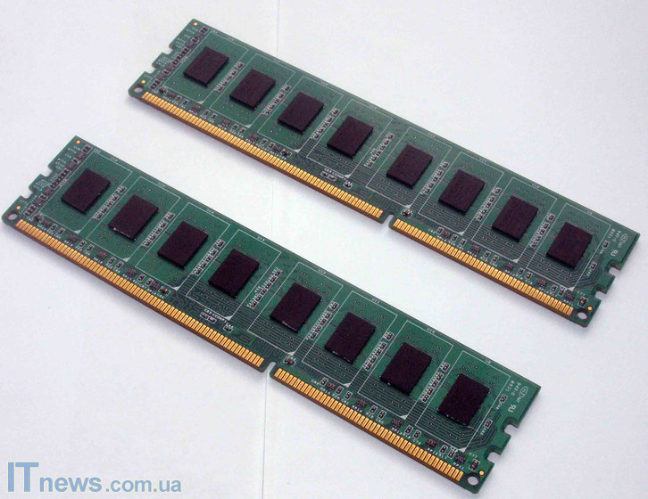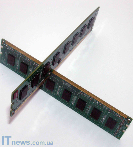 Оба модуля распаяны на платах зеленого цвета. С обеих сторон платы имеются различные диоды, транзисторы, и, разумеется, чипы, без которых, собственно, память работать не будет. С каждой стороны платы реализовано по восемь чипов, распаянных равномерно по всей плоскости платы.