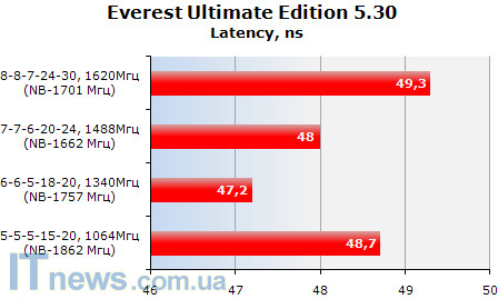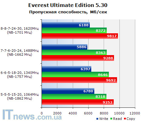 Ниже показатели производительности памяти, достигнутые при помощи утилиты Everest Ultimate Edition 5.30.