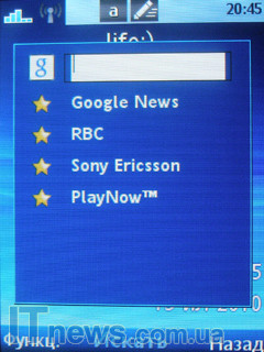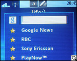 Кнопки справа и слева от джойстика, расположенные непосредственно под дисплеем, являются свободно-программирующимися. По умолчанию левой кнопке присвоена особенность вызова приложения "Мультимедиа", а правая активирует приложение "Искать". Это приложение визуально напоминает смесь строки поиска и нескольких областей поиска, перечень для выбора которых расположен сразу же за строкой – это Google News, RBC, Sony Ericsson и пр.