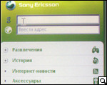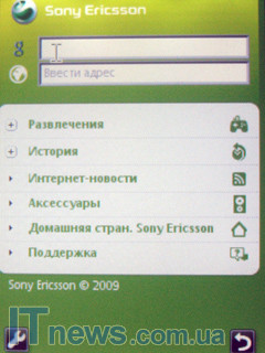 Интернет-браузер – приложение, идущее первым в меню Sony Ericsson Elm, реализовано в традиционной оболочке Sony Ericsson, то есть, фирменный стиль страницы, а также несколько ссылок на главные разделы сайта вендора. Выше этих ссылок расположена адресная строка и строка поиска Google. Настройки браузера доступны для вызова нажатием левой кнопки, которая расположена сразу же под дисплеем.