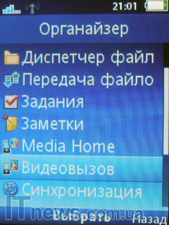 В подпункте меню "Органайзер" реализовано самое интересное - приложение "Видеовызов". Уверен, его предназначение понять легко. Подраздел "Синхронизации", расположенный в этом же разделе, позволяет устройству синхронизировать контакты, заметки, задания и прочее со специальным сервером, вход на который защищен паролем пользователя – такой себе backup.