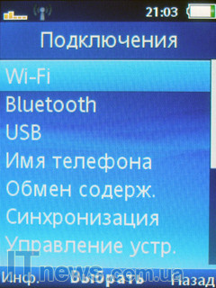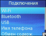В подпункте меню "Параметры" создан раздел "Подключения". Из него пользователь получает возможность работать с модулями беспроводного обмена данными Bluetooth и Wi-Fi, а также обмениваться данными или использовать телефон в качестве модема при подключении его к компьютеру плюс всячески манипулировать с настройками синхронизации, протоколами EDGE и GPRS и прочее.