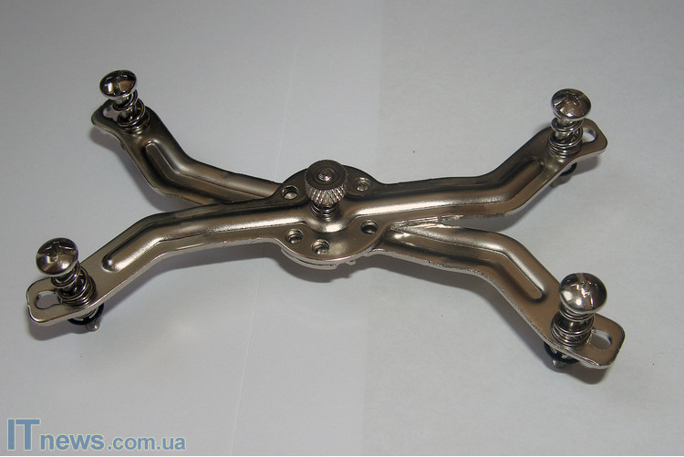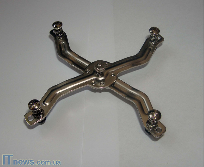Крепление, которое фиксирует кулер, также соответствует концепции универсальности. Внешне крепление похоже на ножницы. Впрочем, именно благодаря такой конструкции, пользователь легко подберет расстояние между монтажными отверстиями на материнский плате и зафиксирует крепление. Лично у нас эта процедура не заняла и пяти минут.
