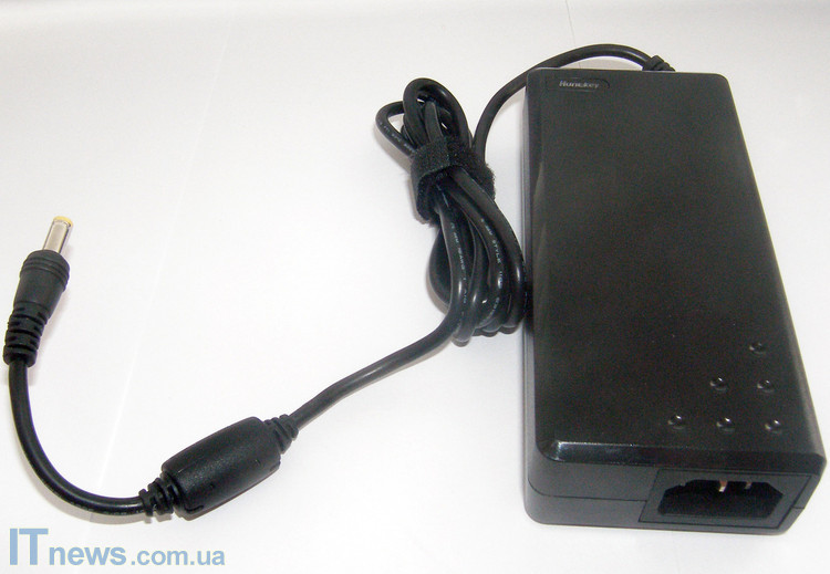 Интересной нам показалась маркировка, расположенная возле самой сетевой вилки. Здесь также вынесены данные о маркировке продукта, данные о напряжении и прочем. Не совсем понятно, для каких целей расположены там эти данные, поскольку кабель, которым адаптер подсоединяется к электросети, универсальный – точно такой же используется для подключения стационарных компьютеров к электросети – на нем вынесены точно такие же характеристики. Да и, кроме того, спецификации этого кабеля никак не зависят от работы адаптера, поскольку исходящее напряжение преобразуется уже в адаптере.