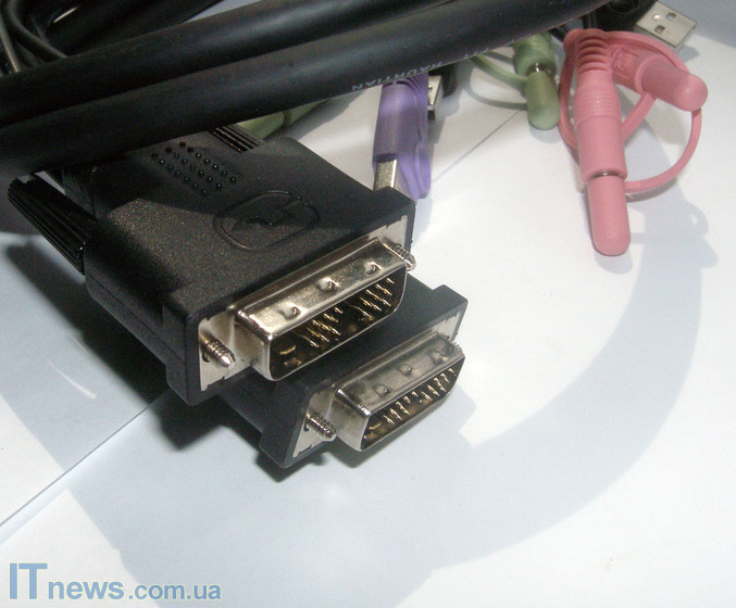 Как мы уже отмечали, устройство выполнено в форме небольшой прямоугольной коробки, с одной из боковых граней которой выведено несколько толстых кабелей с портами DVI на конце. Посредством их, собственно, и происходит состыковка с видеокартой на блоке. Кроме того, с тыльных сторон портов DVI выведено по нескольку других кабелей, которые значительно отличаются от предыдущих по диаметру. На концах этих шнуров реализованы 3,5 мм вилки, а также USB коннекторы. Во время состыковки с системными блоками, эти кабеля отвечают за подключение USB мышки и клавиатуры плюс микрофона, колонок и другой периферии. Детальнее мы покажем на специальной схеме.