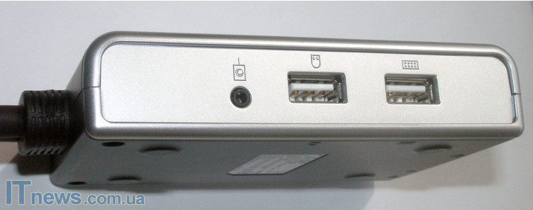 На правой боковой панели реализованы два USB порта, а также небольшой разъем для подключения переключателя портов. К слову, что любопытно, над USB интерфейсами мышки и клавиатуры даже выгравированы соответствующие эмблемы – миниатюрная мышка и миниатюрная клавиатура. Таким образом, производитель подсказывает, что подключать периферию нужно строго к соответствующему интерфейсу, а не произвольно.