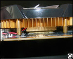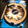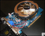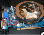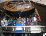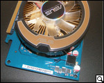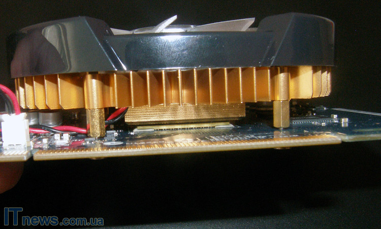 Примерно по центру лицевой панели видеокарты расположена достаточно большая система охлаждения графического ядра. Система состоит из большого медного радиатора, а также 80 миллиметрового кулера, который по отношению к радиатору словно одет на внешнюю его часть. Кроме того, словно в виде некой окантовки вокруг кулера проходит некая пластиковая насадка, с достаточно большими бортиками. Эти бортики позволяют направлять воздух к графическому ядру именно потоком, что по идее усиливает процедуру охлаждения процессора, а, кроме того, по словам производителя, блокирует 66% электромагнитного излучения.