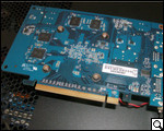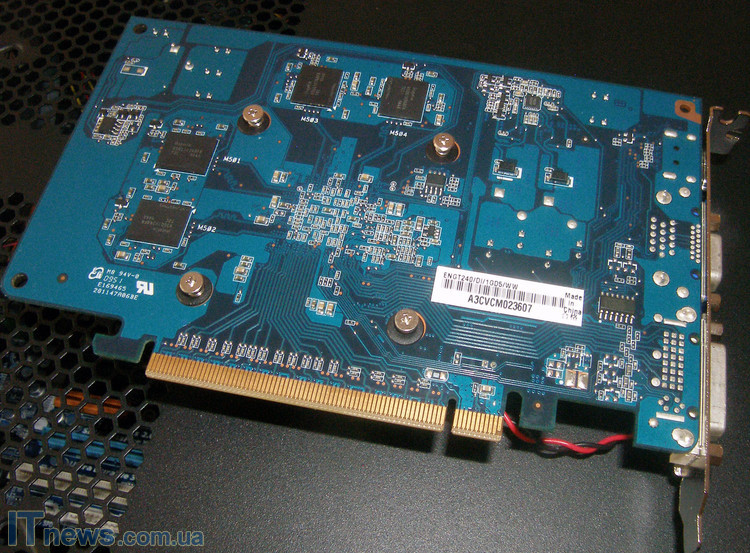 На тыльной панели платы реализована также всевозможная распайка – имеются клеммы от hynix, различные микротранзисторы и диоды. Здесь же находится небольшая информационная наклейка, с данными о полном названии видеокарты, а также стране-изготовителе.