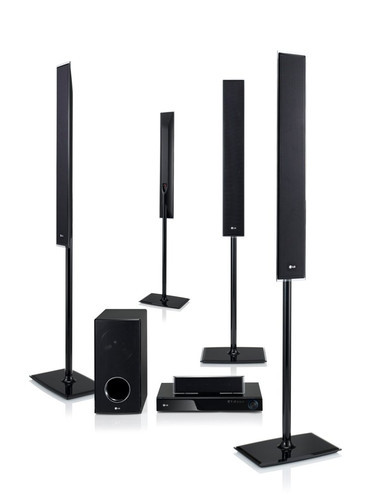 Внешность LG HTK965TZ не содержит ярких и необычных элементов, как часто практикуется у этого производителя. Но, тем не менее, своя изюминка в дизайне театра есть - это удивительно тонкие, толщиной всего 29 мм, колонки. Причем тонкими являются как фронтальные, так и тыловые сателлиты. Поскольку они еще и плоские, то очень удачно смотрятся, будучи повешенными на стене. Безусловно, если вы планируете разместить акустику на стенах театра, сэкономив внутреннее пространство помещения, то модель LG HTK965TZ покажется очень привлекательной. Впрочем, колонки возможно устанавливать и на подставках – это позволяет свободно варьировать размещение сателлитов театра в пределах большого помещения. В целом, к дизайну театра претензий нет. Единственное «но» – большие «квадратные» опоры подставок выглядят в домашней обстановке несколько грубовато.