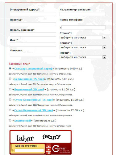 При регистрации я выбирал акционный тарифный план "Стандарт" со 100 бесплатными минутами на 3 страны мира. Однако оказалось, что "бесплатные минуты, входящие в тарифный план, недоступны, и действует обычный предоплаченный тариф". Так что для звонков после тестирования надо пополнить счет и выбрать подходящий тариф.