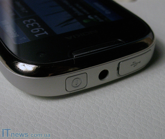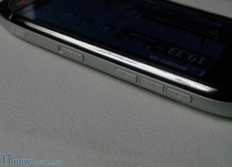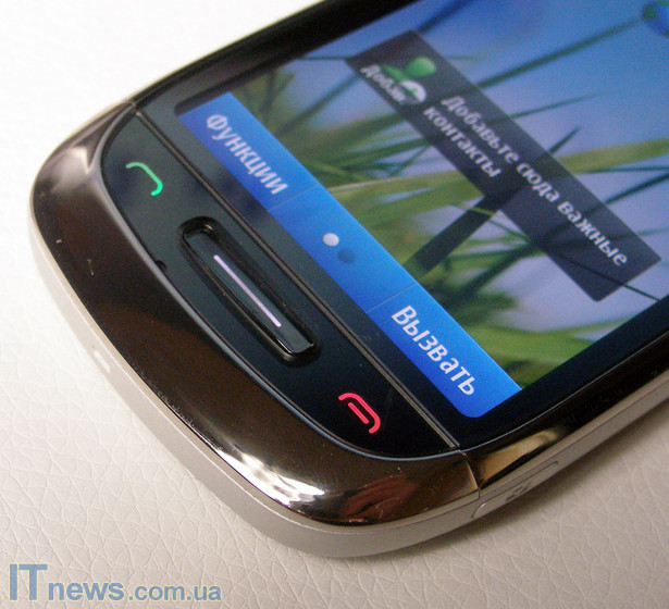 Под дисплеем устроены три хард-клавиши. Справа и слева это кнопки работы со звонками. Клавиша в центре отвечает за активацию перехода в главное меню Nokia C7.
