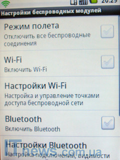 В этом же подпункте меню пользователю доступны настройки и работа с модулями беспроводного обмена данными Wi-Fi, а также Bluetooth. Модуль Wi-Fi поддерживает профили 802.11 b/g, а Bluetooth – A2DP и EDR плюс работу со скоростями 2.0.