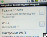 В подменю "Настройки" пользователю предоставлена возможность полноценного управления всеми беспроводными модулями. В подменю "Беспроводные сети" пользователь может активировать подпункт "Режим полета" - таким образом, будут отключены все беспроводные модули.