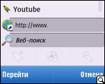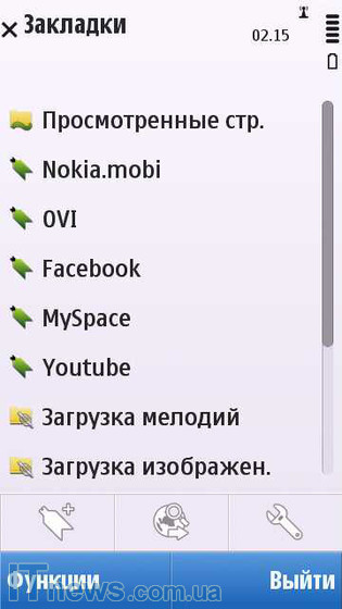 Браузер Интернет в Nokia C5-03 представляет собой небольшое диалоговое окно, в котором в форме лесенки расположены ссылки на различные социальные сети и другие on-line сервисы. Кроме того, в самом низу диалогового окна реализованы небольшие сенсорные кнопки, которые, собственно, открывают доступ ко всей функциональности приложения.