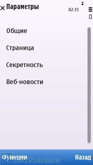 Третья же кнопка, расположенная справа от центра, "позволит" пользователю активировать специальное меню, из которого он получит доступ к четырем подпунктам: "общие", "страница", "секретность", а также "web-новости". Первые три подпункта, как несложно догаться уже из названий, отвечают за настройки браузера. Здесь пользователь имеет возможность отрегулировать настройки точки доступа, кодировки, активировать блокировку всплывающих окон, выбрать размер шрифта и многое другое. Все настройки очень просты для понимания, так что проблем с тем, что в них, разобраться, у пользователя не будет.