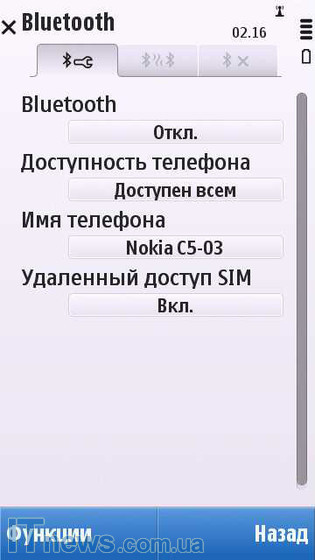 Модуль Bluetooth поддерживает стандарт EDR, а также скорость 2.0. Кроме того, поддерживаются следующие профили: Dial Up Networking Profile (Gateway), File Transfer Profile (Server), Phone Book Access Profile (Server), Advanced Audio Distribution Profile (Audio Source) и пр. Скорость обмена данными в среднем около 100 кбит/c.