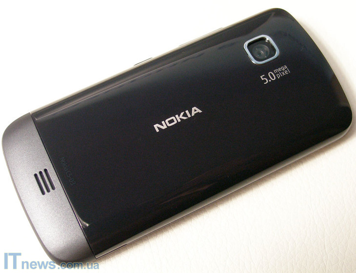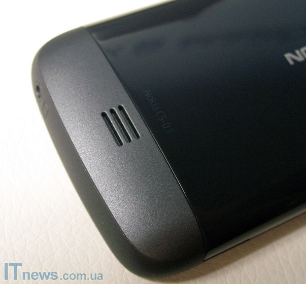 Ниже крышки устроена сетка динамика громкой связи. Согласно данным производителя, в Nokia C5-03 используется стереодинамик. Девайс воспроизводит аудио громко, достаточно объемно, но при этом без существенных искажений.