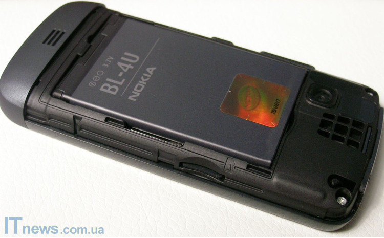 Под крышкой расположен аккумулятор, емкость которого 1000 мАч. Одного 100% заряда аккумулятора достаточно для трех суток работы смартфона при средних нагрузках 2 часа в режиме разговоров, а также около полутора часов работы с другими функциями и особенностями смартфона.