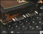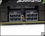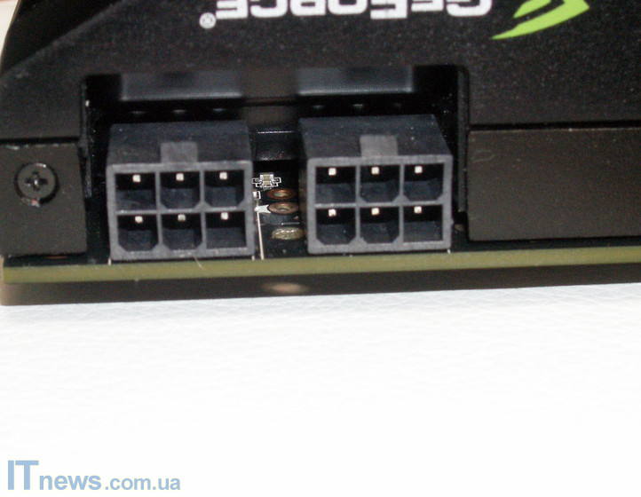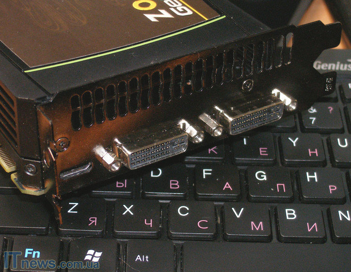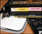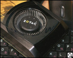 На верхней боковой грани ZOTAC GeForce GTX 570 расположена небольшая, по всей видимости, вентиляционная сетка. Кроме нее, здесь нарисована эмблема компании-производителя, а также расположены два отдела для подключения питания.