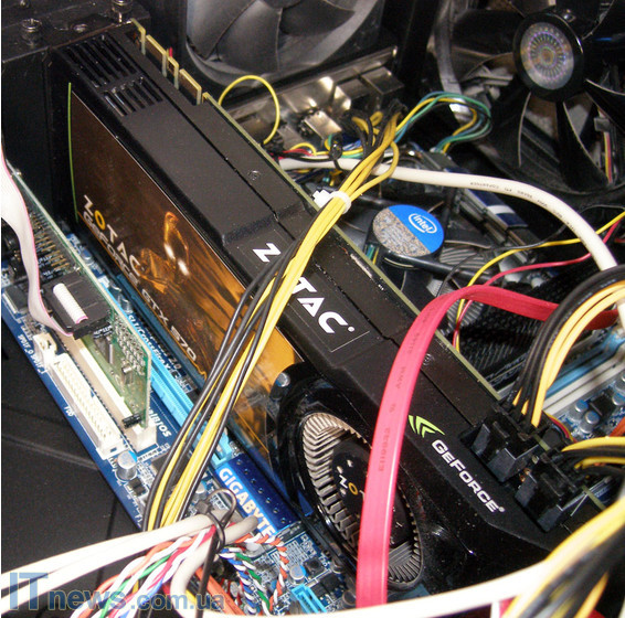Для тестирования видеокарты ZOTAC GeForce GTX 570 был собран тестовый стенд, состоящий из следующих компонентов: материнская плата Gigabyte GA-P55M-UD4, процессор Intel Core i5 CPU 760 @ 2.80GHz, 2870 МГц, два модуля оперативной памяти Kigmax DRR3 Hercules 2200 ГГц общим объемом 4 ГБ плюс блок питания Huntkey APFC POWER MAX700 Вт. Все комплектующие были помещены в закрытый корпус – модель корпуса Cooler Master CM 690. Температура в комнате 25 градусов. Все окна и двери были закрыты во избежание случайных порывов ветра.
