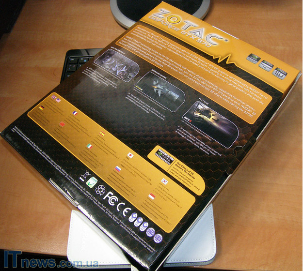 Упаковка, в которой поставляется ZOTAC GeForce GTX 570, выполнена в тонах, которые наследуют все последние продукты ZOTAC в этом сегменте. Перед нами достаточно большая коробка, выполненная в коричневом и темно-желтом тонах, с огромным количеством всевозможной информации, изображений и других данных, как об особенностях продукта, так и об особенностях комплекта поставки и подключения устройства. Останавливаться на них детально не буду, несколько фотографий упаковки ниже все покажут.