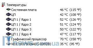 После чего, при помощи утилиты EVEREST ULTIMATE EDITION, я отметил следующий температурный показатель: