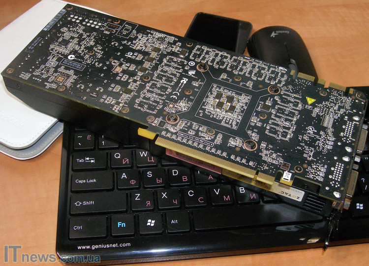 Противоположная сторона ZOTAC GeForce GTX 570 полностью прикрывается большим пластиковым коробом. Крепление короба на плату неплохое, но вместе с тем не совсем идеальное – заметен небольшой люфт. Впрочем, справедливости ради отмечу, что люфт, быть может, присутствовал только в моем тестовом образце, однако пользователю все же рекомендую обратить внимание на эту "мелочь" во время осмотра устройства на стадии покупки.