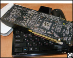 Описываемая модель распаяна на текстолитовой плате коричневого цвета, также имеет большой пластиковый короб, проходящий параллельно всей лицевой части устройства, а, кроме того, на одной из граней расположен вентилятор, сконструированный по турбинному принципу. Точно такой же и ASUS GeForce GTX580.