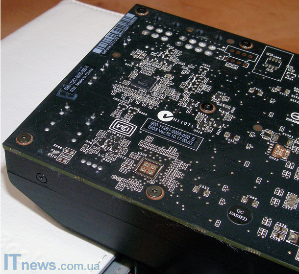 На нижнем боковом торце расположен слот PCIEx16 для крепления устройства на материнскую плату, а также несколько наклеек с различными техническими данными об устройстве и небольшая вентиляционная сетка.