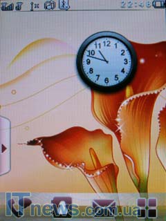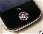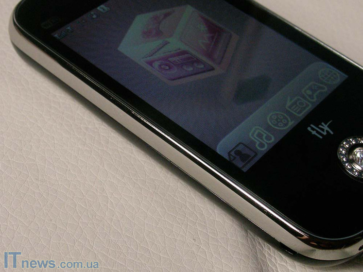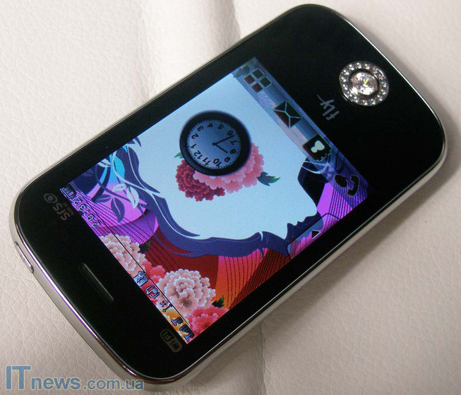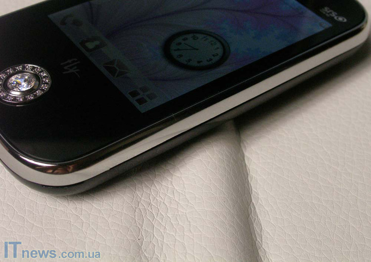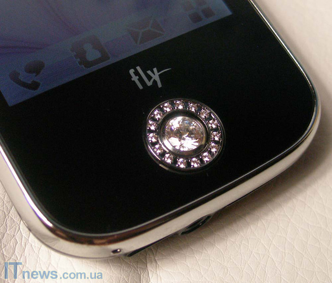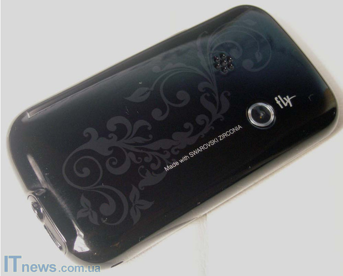 Внешне Fly E181 Sophie выглядит замечательно. Независимо от того, в белом или в черном корпусе, оформление и лицевой, и тыльной панелей шикарное – темный силуэт дисплея в еще более темной окантовке с различными вставками над ним, а также элегантной кнопкой навигации с функцией подтверждения выбора в центре. А ведь не забывайте, кнопка выполнена из цирконов Swarovski. Словом, выглядит намного дороже заявленных 1299 гривен стоимости.