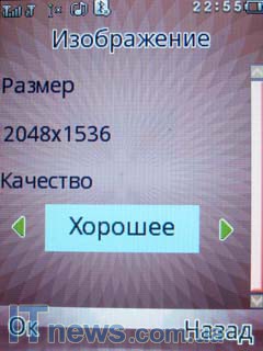 Встроенная камера реализована на базе 3,2-мегапиксельной камеры. Максимальное разрешение снимка 2048х1536 точек, а максимальное разрешение видео 320х240 точек. Остальные настройки ниже.