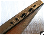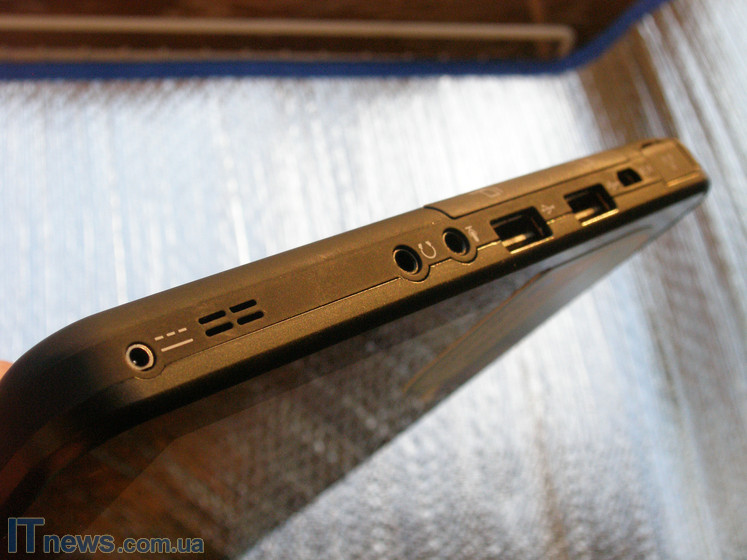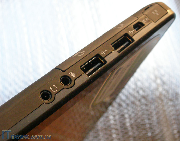 На левой боковой панели находится порт Ethernet/LAN, разъем mini-VGA, а также два порта USB плюс разъемы для подключения наушников и микрофона, прорезь, "прячущая" под собой стереодинамик. Резюмирует же этот" разъемный потенциал" порт для подключения кабеля зарядного устройства, а также разъемы под SIM-карту плюс карту памяти.