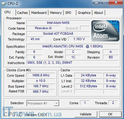 Impression ImPAD 0111 разработан на базе процессора Intel Atom N450, кодовое имя которого Pineview-N. Socket 437 FCBGA8. Частота процессора 1,66 ГГц.