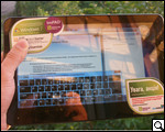 На лицевой панели, начиная с окантовки и ближе к центру, расположено несколько информационных наклеек, на которых выведены данные, в частности, об операционной системе, реализованной в "штате" Impression ImPAD 0111, а также акции, проводимой компанией "Навигатор" в рамках продаж Impression ImPAD 0111. Наклейки легко снять.