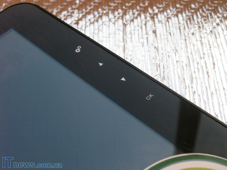 Итак, помимо дисплея, прикрытого защитным глянцевым стеклом, на лицевой панели расположен глазок встроенной камеры (на верхней окантовке), датчик освещенности (на нижней), а также несколько сенсорных кнопок. Последние из элементов находятся на правой окантовке дисплея.