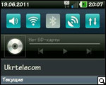 В самом верху дисплея расположена некая техническая строчка, ярлыки на которой отвечают за уровень заряда аккумулятора, сигнал сотовой сети, а также различные другие уведомления. Здесь же расположена и небольшая строчка с ярлыками активации некоторых беспроводных модулей, что по-своему очень удобно – не нужно выносить виджеты этих приложений на какой-либо из рабочих столов, либо переходить в меню, чтобы запустить тот или другой беспроводной модуль.